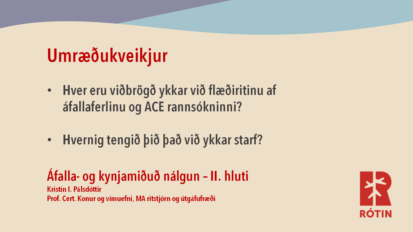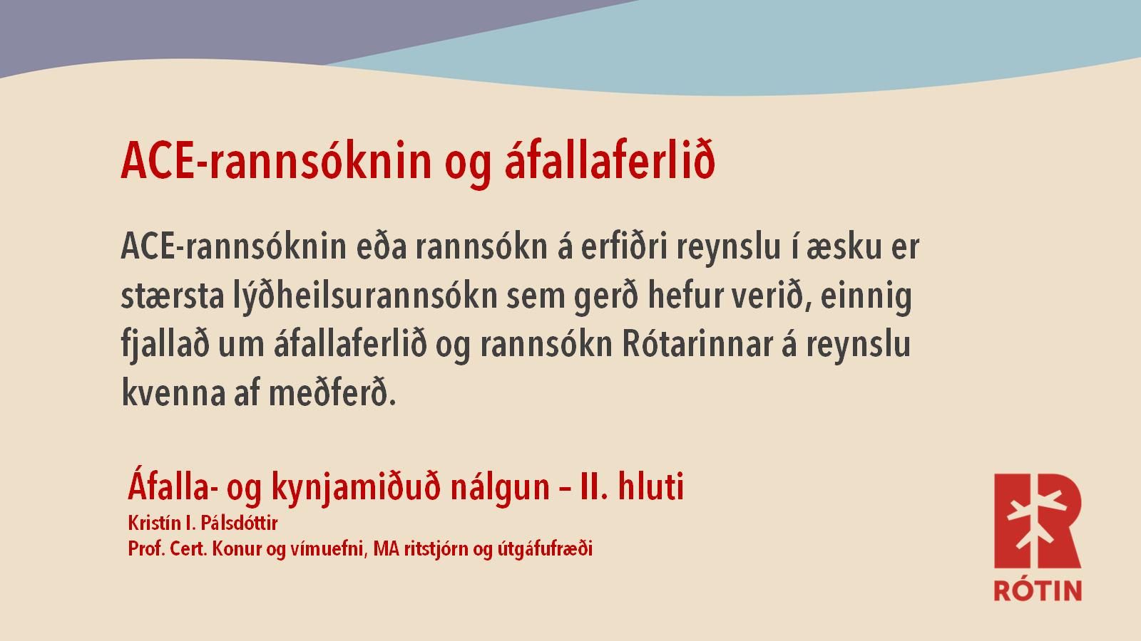 Fjallað er um ACE-rannsóknina, rannsókn á erfiðri reynslu í æsku, sem er stærsta lýðheilsurannsókn sem gerð hefur verið, áfallaferlið og rannsókn Rótarinnar á reynslu kvenna af meðferð.