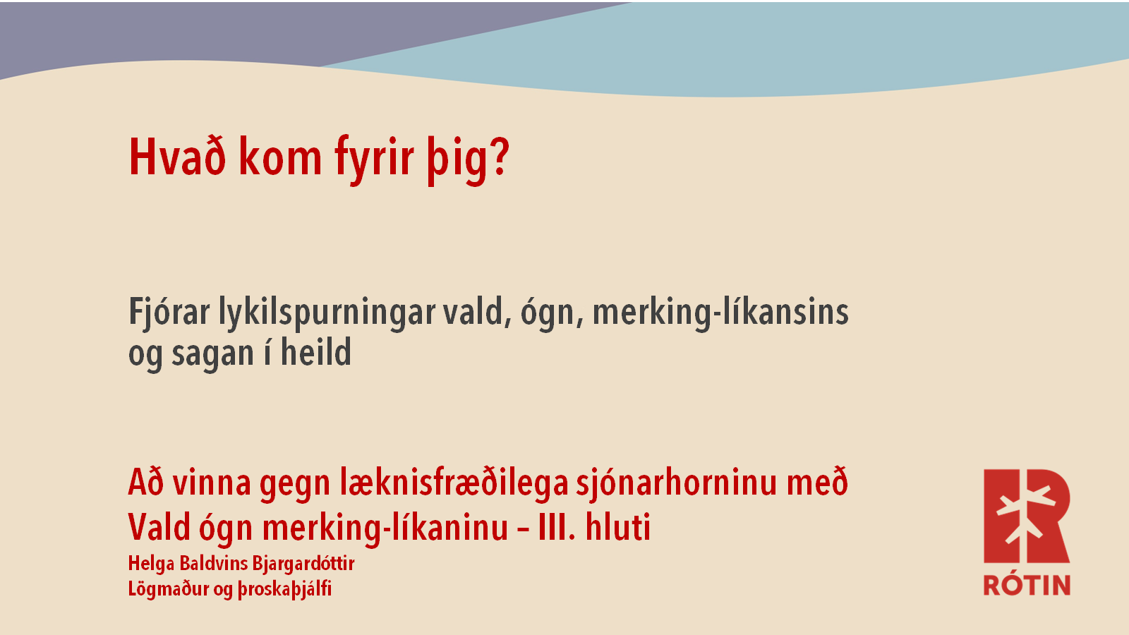 Helga Baldvins Bjargardóttir, þroskaþjálfi, lögmaður, aðjúnkt við Háskóla Íslands fjallar um vald, ógn, merking-líkanið sem var sett fram sem mótvægi við sjúkdómsvæðingu og í samræmi við þá áfallaþekkingu sem nú er viðurkennd og þar með áhrif áfalla á heilsufar, þróun vímuefnavanda og önnur skaðleg bjargráð. o I. hluti – Læknisfræðilega sjónarhornið á fólk – 8:59 mín. o II. hluti – Heildræn áfallamiðuð nálgun – 12:44 mín. o III. hluti – Hvað kom fyrir þig? – 12:29 mín.