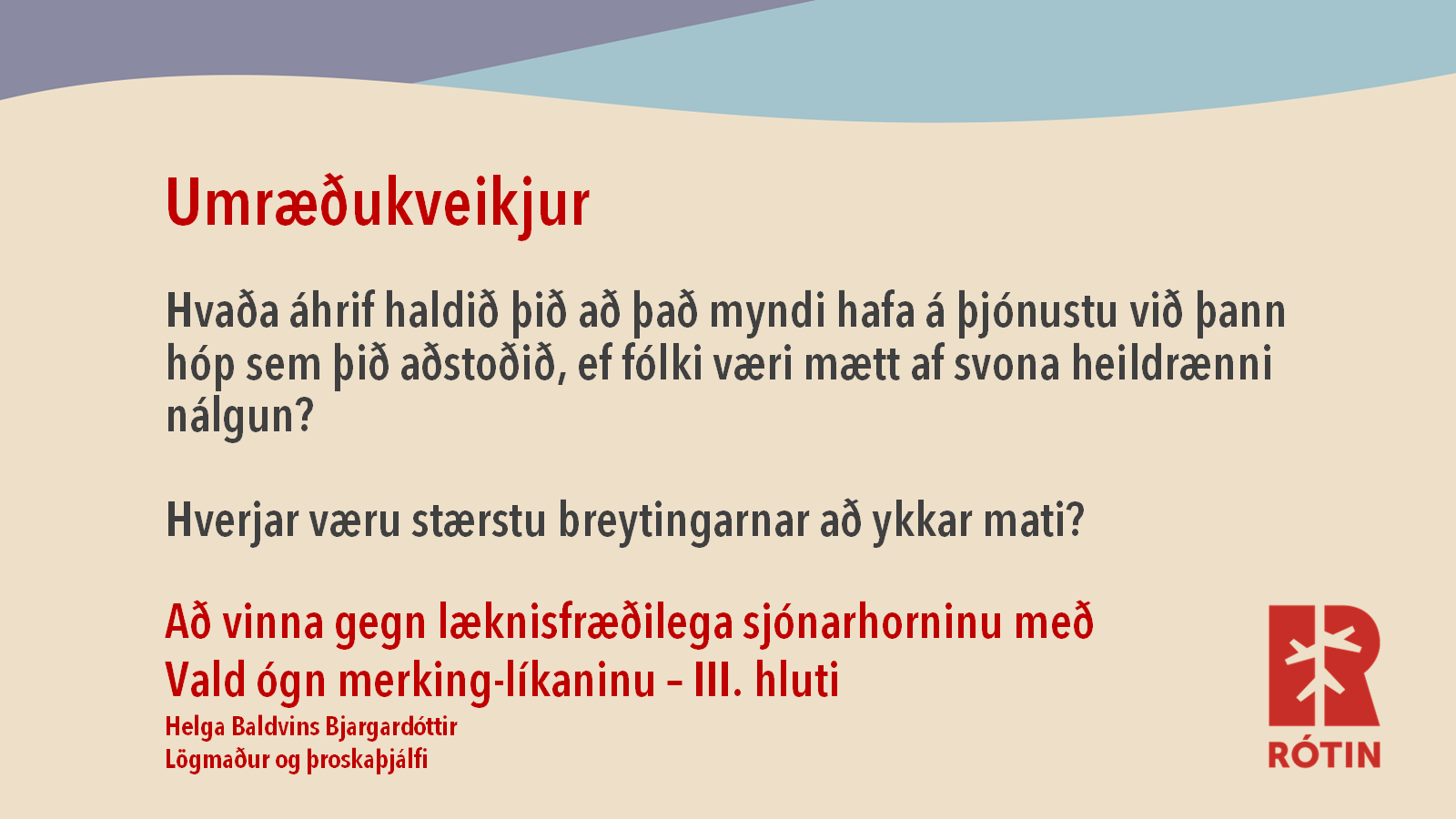 Nanna Hlín Halldórsdóttir, sérfræðingur hjá Siðfræðistofnun HÍ fjallar um berskjöldun. I. hluti – Manneskjan og kerfið – 16:26 mín. II. hluti – Nýr mannskilningur – 15:09 mín. III. hluti – Langvinn veikindi og berskjöldun – 17:26 mín.
