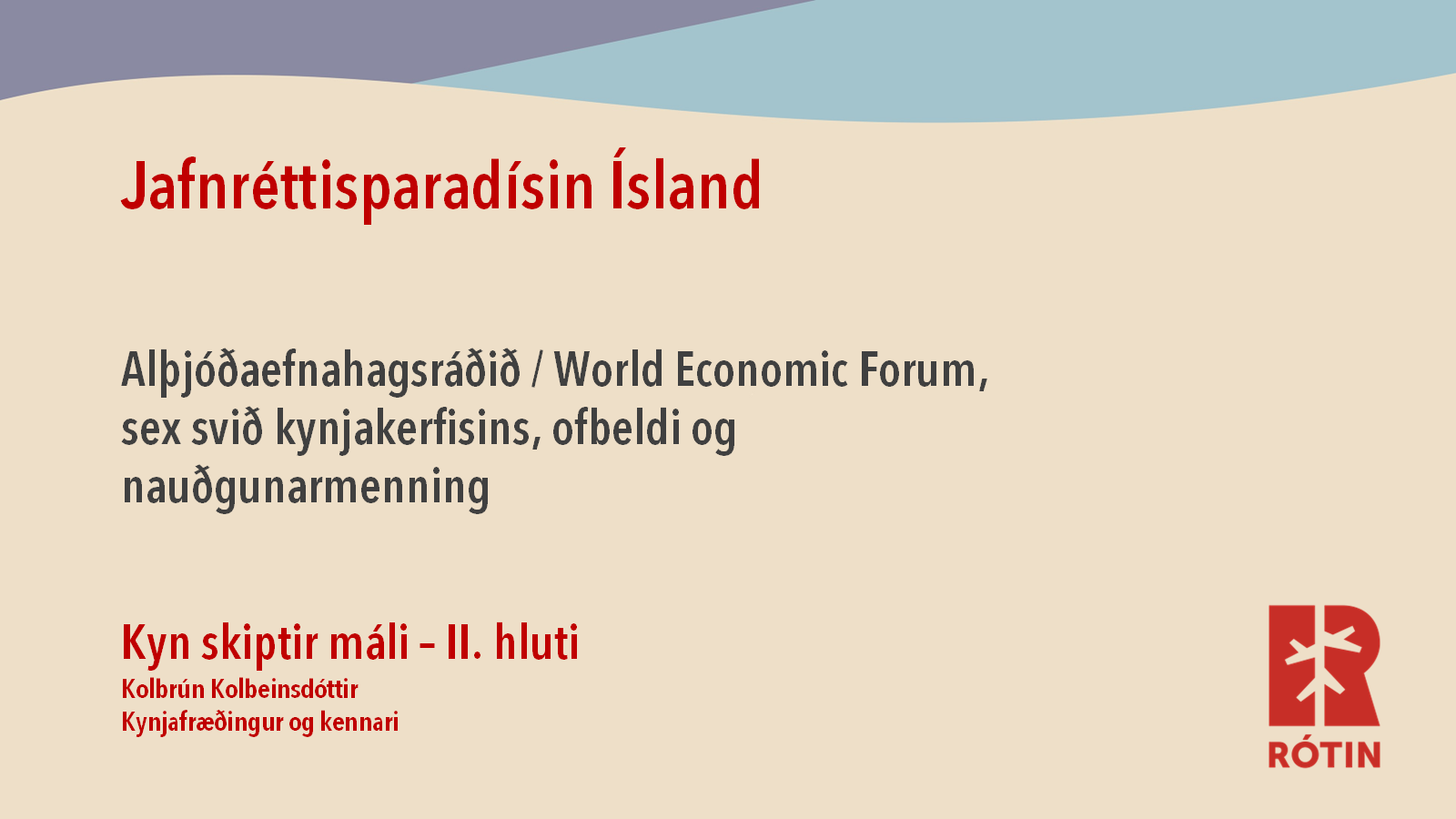 Fjallað um stöðu jafnréttismála á Íslandi og í alþjóðlegu samhengi. Alþjóðaefnahagsráðið / World Economic Forum, sex svið kynjakerfisins ásamt ofbeldi og nauðgunarmenningu.