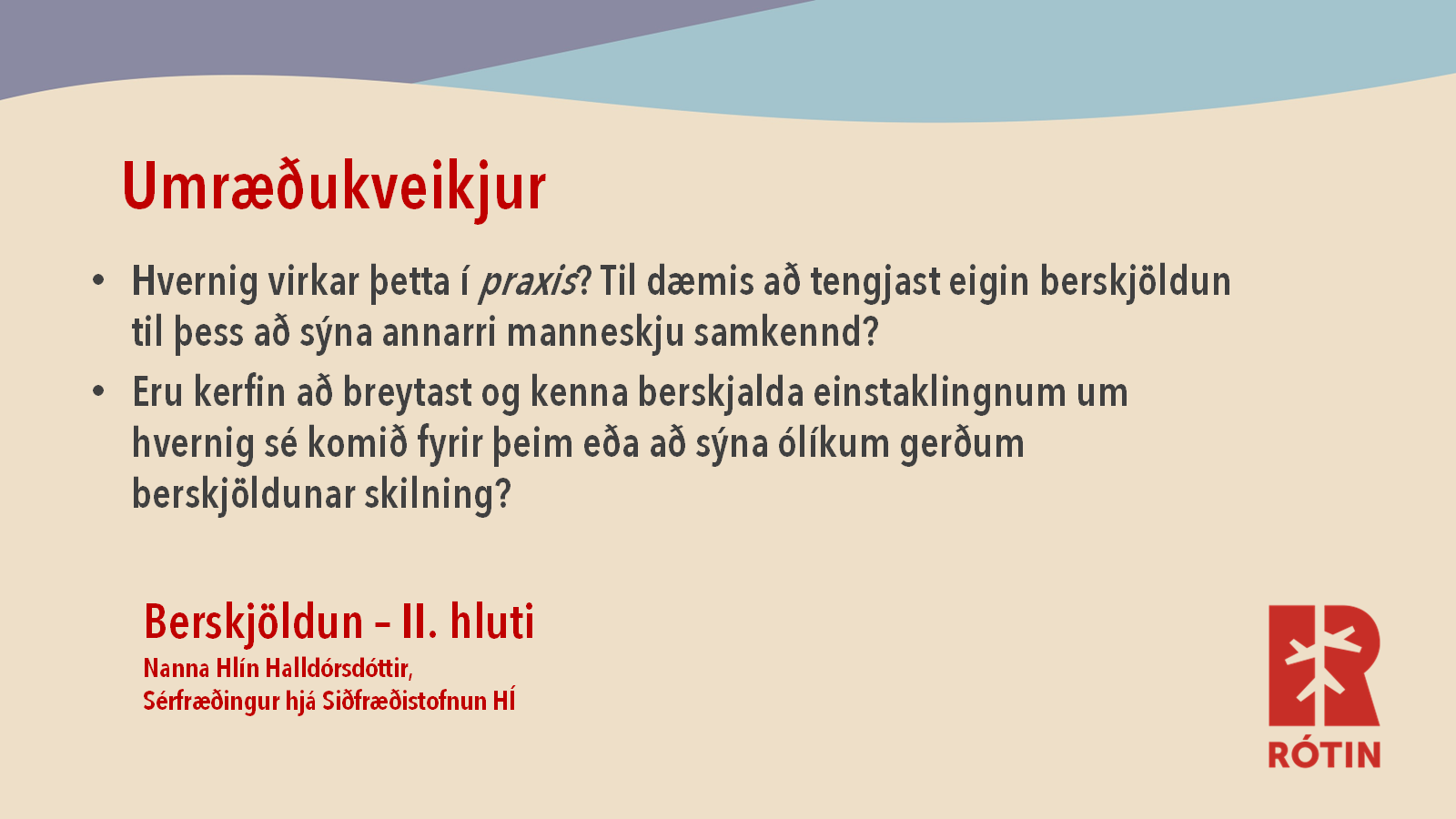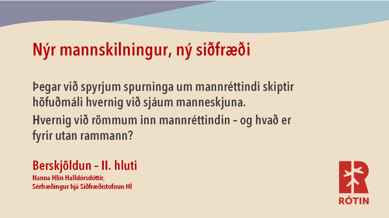 Nanna Hlín Halldórsdóttir, sérfræðingur hjá Siðfræðistofnun HÍ fjallar um berskjöldun. I. hluti – Manneskjan og kerfið – 16:26 mín. II. hluti – Nýr mannskilningur – 15:09 mín. III. hluti – Langvinn veikindi og berskjöldun – 17:26 mín.