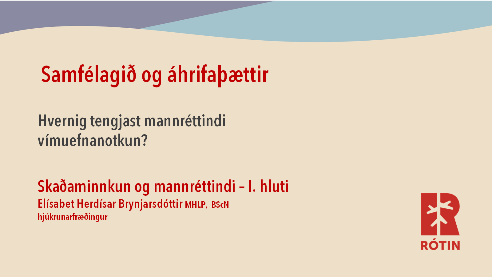 Elísabet Herdísar Brynjarsdóttir, MHLP, BScN hjúkrunarfræðingur fjallar um: I. hluti – Samfélagið og áhrifaþættir – 11:12 mín. II. hluti – Hvað er skaðaminnkun? – 10:25 mín. III. hluti – Hvernig beitum við skaðaminnkun? – 8:53